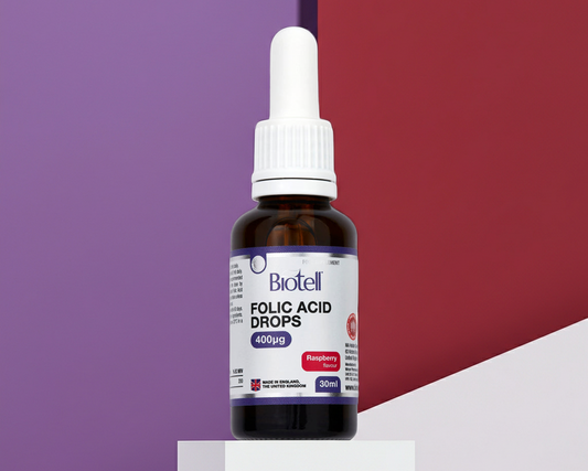 Biotell Folic Acid Drops 400µg support normal blood formation, energy metabolism, and maternal health during pregnancy. Easy-to-use daily liquid drops.