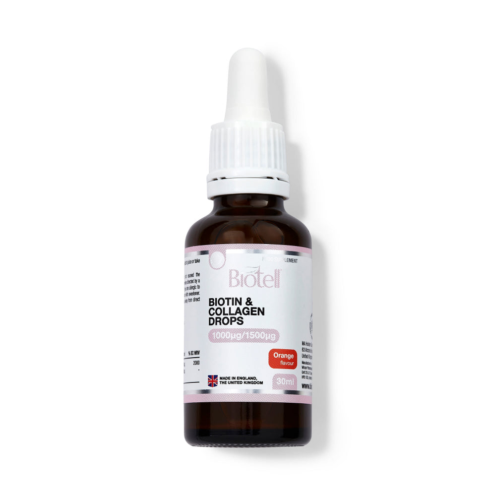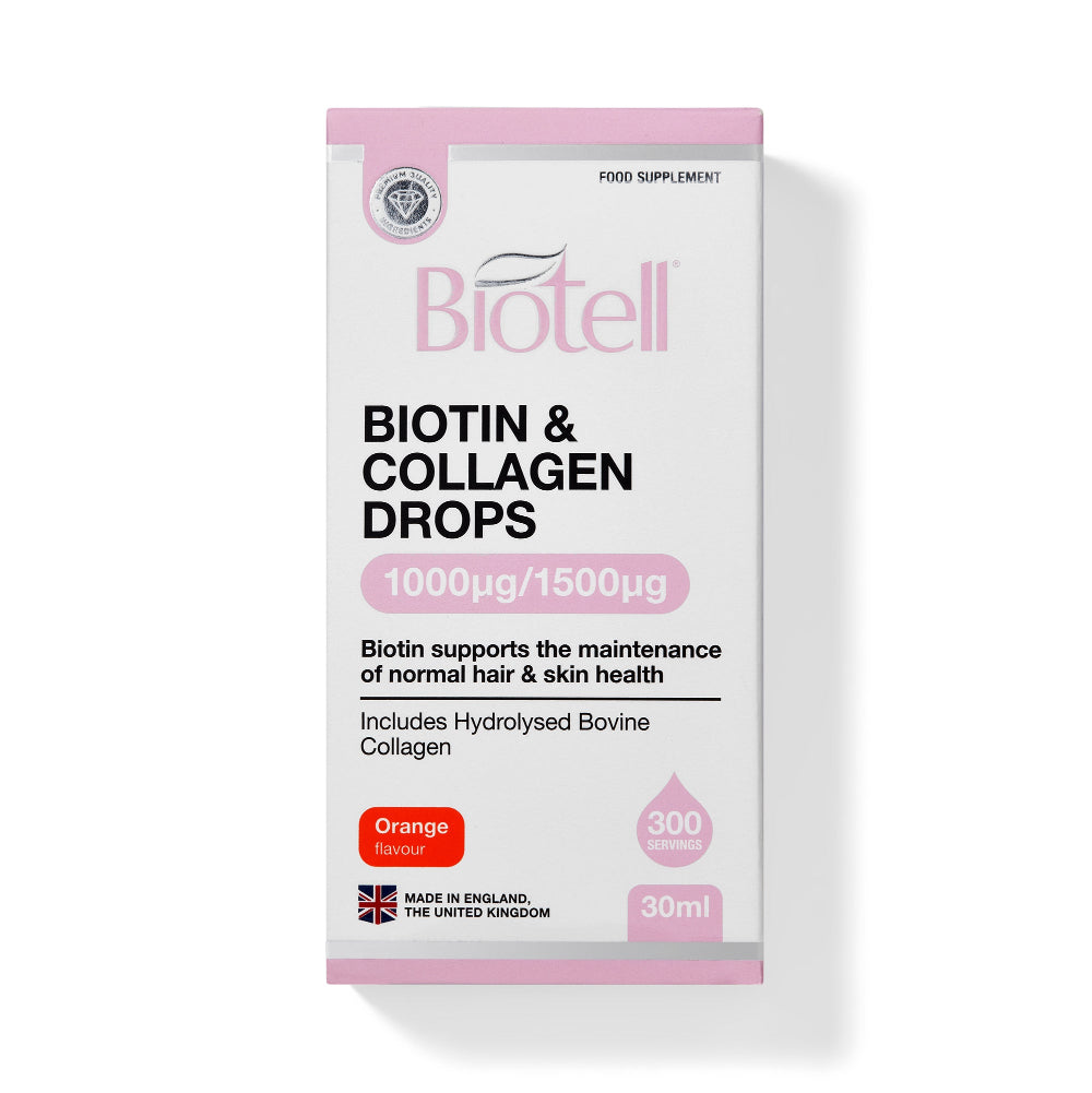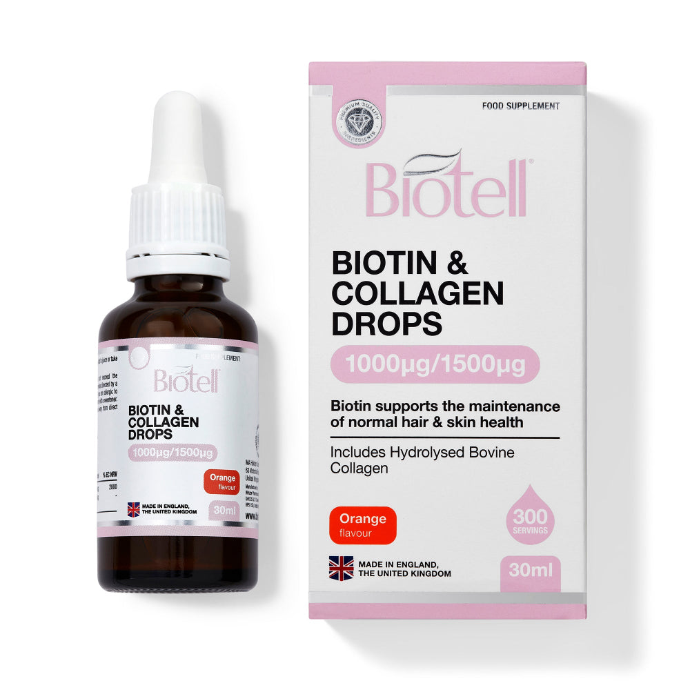 Support healthy hair, skin, and nails with Biotell Biotin & Collagen Drops. 1000μg Biotin + 1500μg Collagen per dose. Easy-to-take liquid for daily beauty from within.