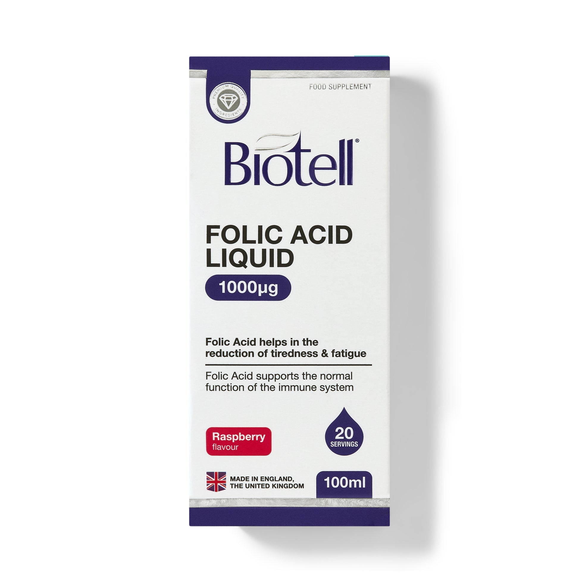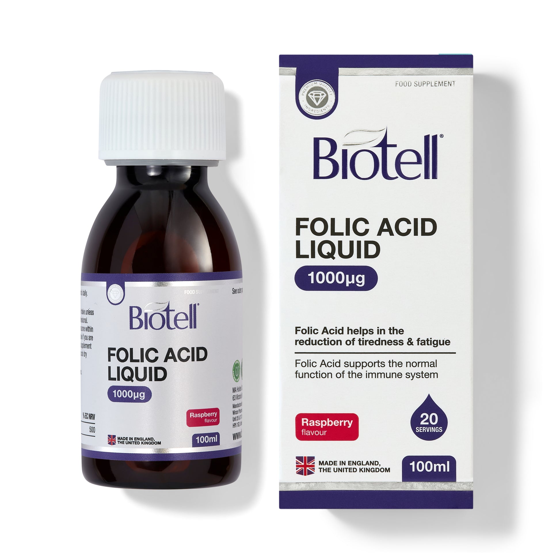 Biotell Folic Acid Liquid 1000µg delivers high-strength folate to support immune function, reduce tiredness and fatigue, and promote healthy pregnancy.