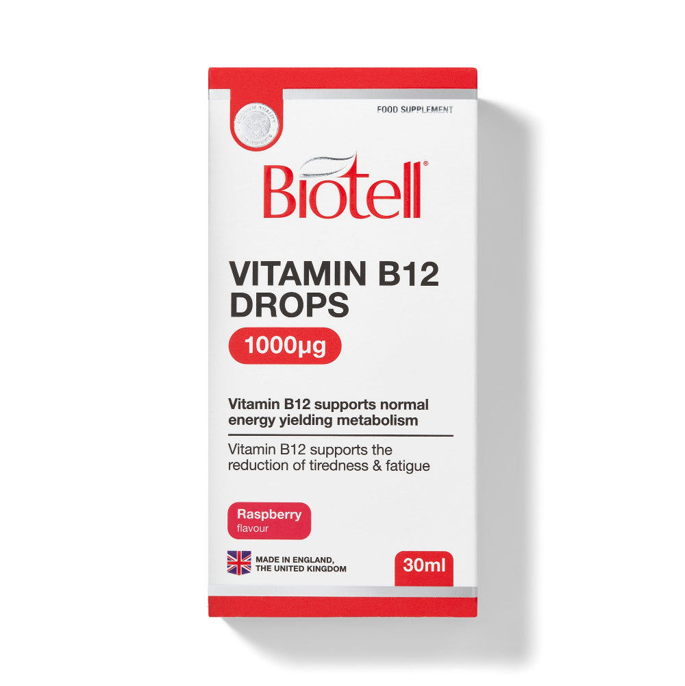 Biotell Vitamin B12 1000µg Drops help support energy release, red blood cell formation, and reduce tiredness & fatigue. Vegan-friendly liquid B12 formula.