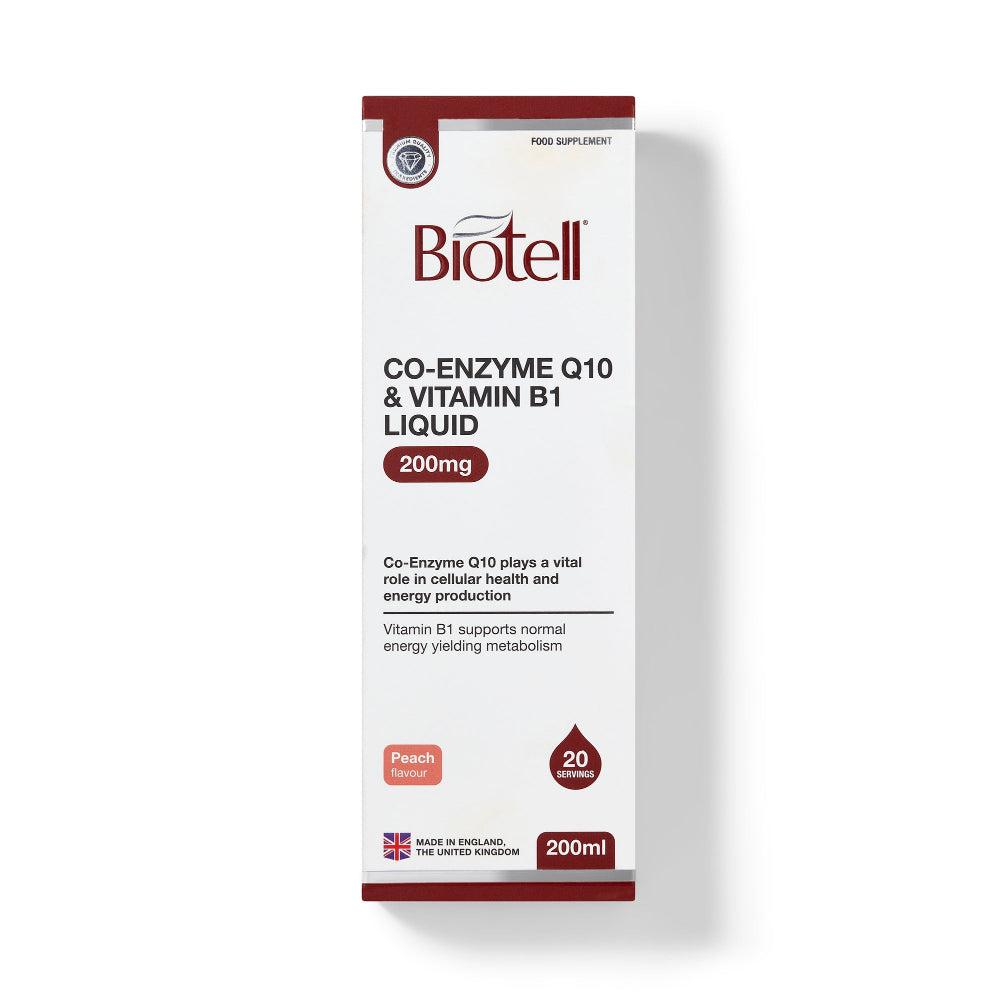 Support heart health, energy, and cellular regeneration with Biotell Co-Enzyme Q10 200mg & Vitamin B1 Liquid. High-strength, fast-absorbing formula to replenish CoQ10 levels and aid metabolism.